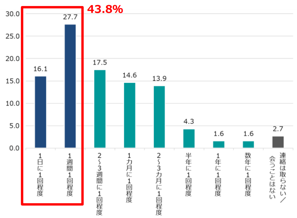 別居している親と連絡を取る頻度について聞いたところ、週に1日以上連絡を取っている人が43.8%いることが分かりました(「1日に1回程度」(16.1%)「1週間に1回程度」(27.7%)の合計)。【図1】