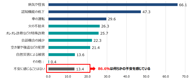 別居している親の暮らしについて、86.6%もの人が何らかの不安を感じていることが分かりました。具体的な不安としては、「病気や怪我」(66.1%)が最も多く、次いで「認知機能の低下」(47.3%)、「車の運転」(29.6%)が上位にランクインしました。【図3】