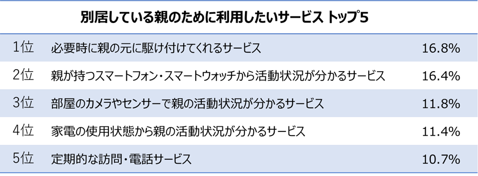 また、別居している親のために今後利用したいサービスについて全体に聞いたところ、1位「必要時に親の元に駆け付けてくれるサービス」(16.8%)、2位「親が持つスマートフォン・スマートウォッチから活動状況が分かるサービス」(16.4%)、3位「部屋のカメラやセンサーで活動状況が分かるサービス」(11.8%)で、「もしもの時に駆け付けてくれる」「親の行動や状況が把握できる」といったサービス需要が一定数あることが明らかになりました。【図6】