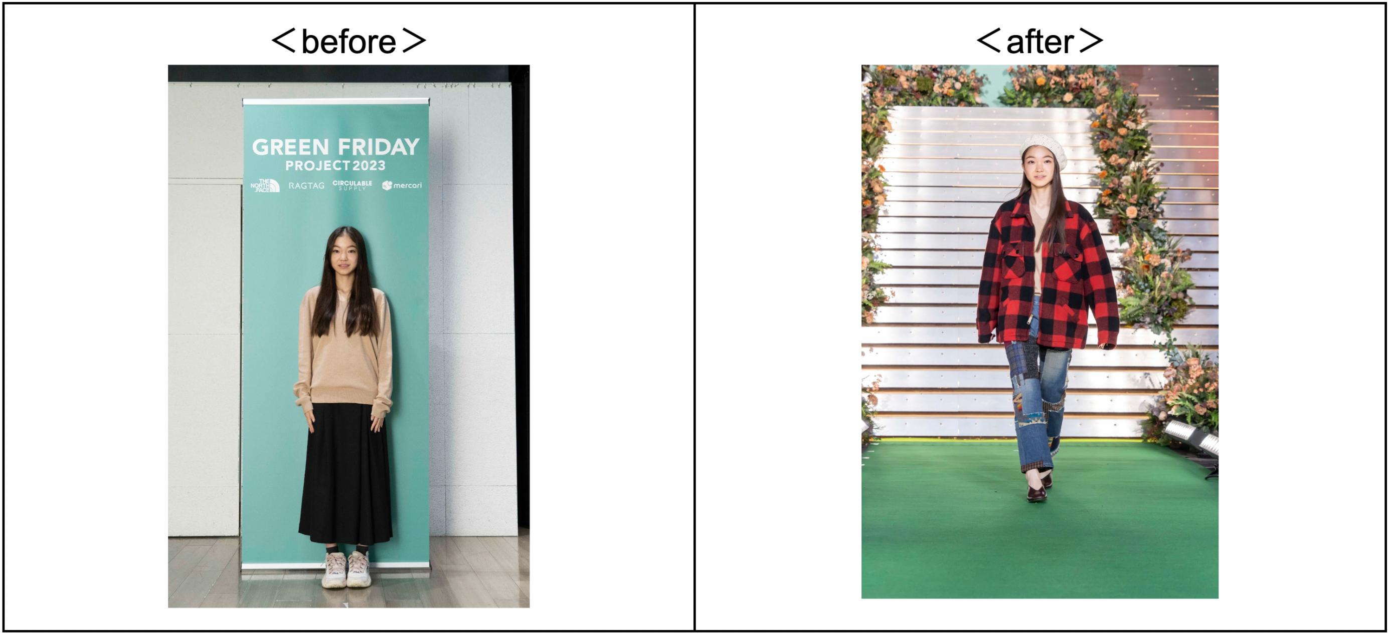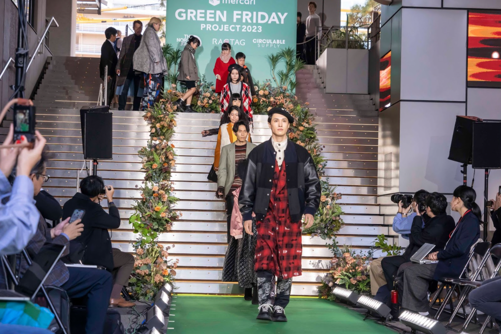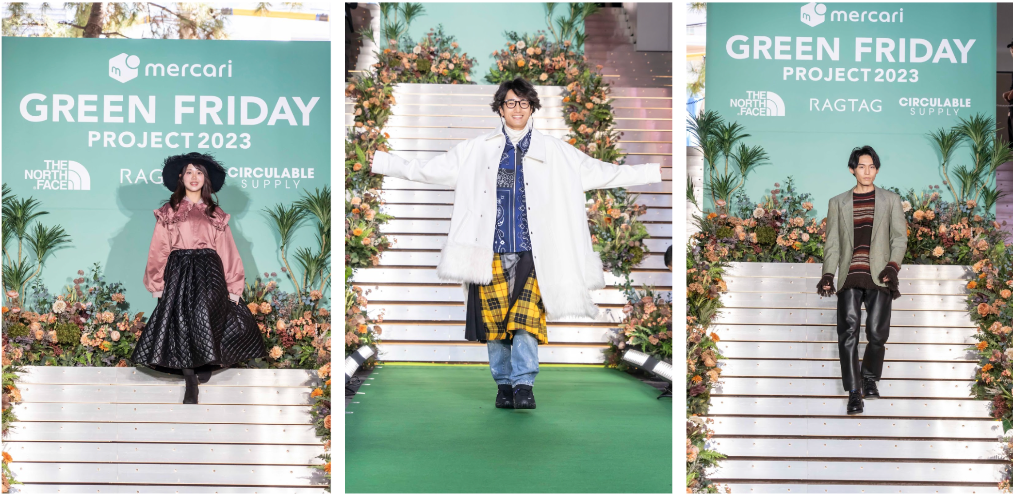ファッションショーでは、フリマアプリ「メルカリ」のお客さまがモデルとして登場。阪急うめだ本店のGREEN AGE(※10)の制作にも参画した人気ファッションスタイリストRIKU OSHIMA氏による「RAGTAG」「メルカリ」「CIRCULABLE SUPPLY」からセレクトした服や「THE NORTH FACE」のリユースアイテム、モデルの方々に持参していただいた服を活用したコーディネートを披露しました。