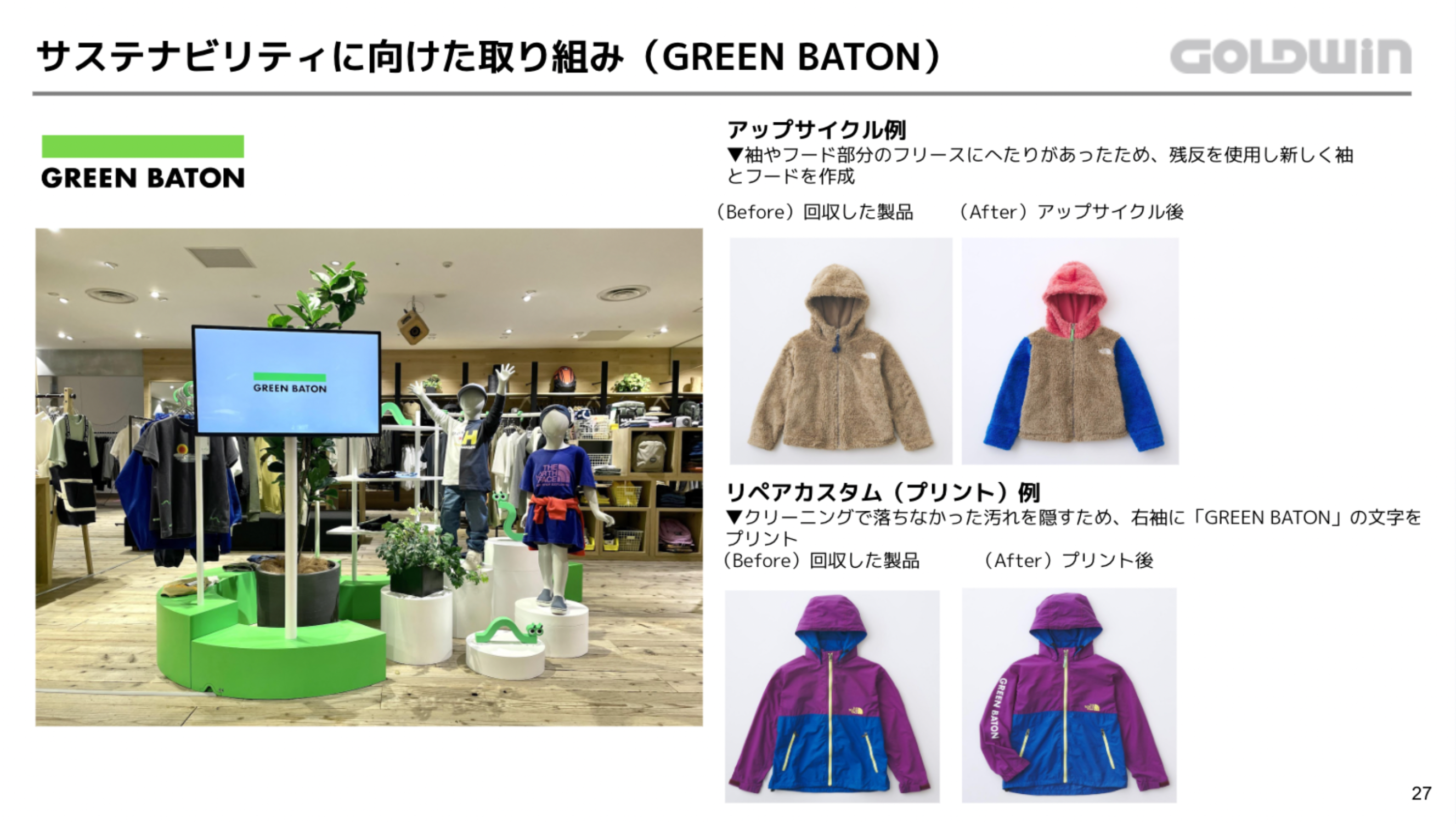 続いて、THE NORTH FACEを展開する株式会社ゴールドウイン 管理本部 ESG経営推進室 勝田 悦弘氏が登壇。勝田氏は「事業活動を通じて、サステナブルな社会構築を行うことで企業価値を高められるという前提に立ち、日々の活動を行っています」とゴールドウインにおける環境改善活動について説明した上で、2008年から開始している「GREEN IS GOOD」の取り組み(※5)や、2021年に発表した長期ビジョン「PLAY EARTH 2030」のなかで定めた環境改善活動における3つの重要課題とそれらの解決に向けて進めている具体策(※6)を紹介。さらに、直近の活動として、約2年でサイズアウトしてしまうとされるキッズウエアを買い取り、クリーニング・リペア・リメイク・アップサイクルを施した製品を再販する新ブランド「GREEN BATON」(※7)の立ち上げについてふれ、「これからもこのような活動を通じて、お客さまとともに、サステナブルな地球環境を目指していきたいと思っています」と話しました。
