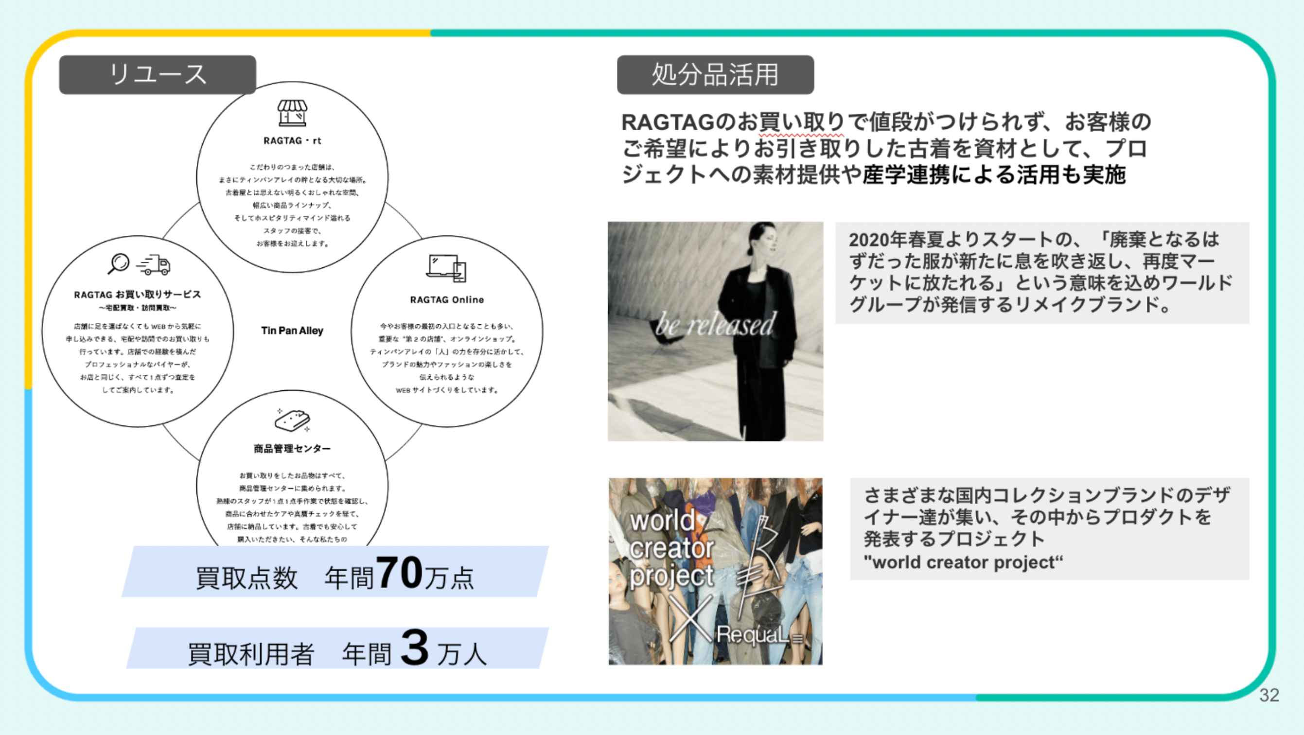 これに加えて、桜庭氏は「お客さまに合意いただいた上で、RAGTAGでお値段がつけられなかった服の引き取りなども行っています」と話し、引き取った服を素材として、新たな服を生み出すリメイクブランド「be released」の展開(※8)や国内コレクションブランドのデザイナーたちが新たなプロダクトを発表する「world creator project」(※9)の実施など、「処分品活用」に関する取り組みを紹介しました。