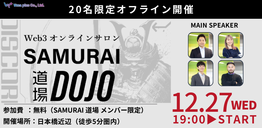 テーマは「SAMURAI 道場 忘年会」として、Vma plusのボードメンバーとSAMURAI道場のメンバーがリアルの場に集まり、これからのWeb3の可能性やメタバースの未来や自身の関心のある分野などについて語り合い、新たなつながりの共創と交流を楽しむコミュニケーションイベントとなっています。