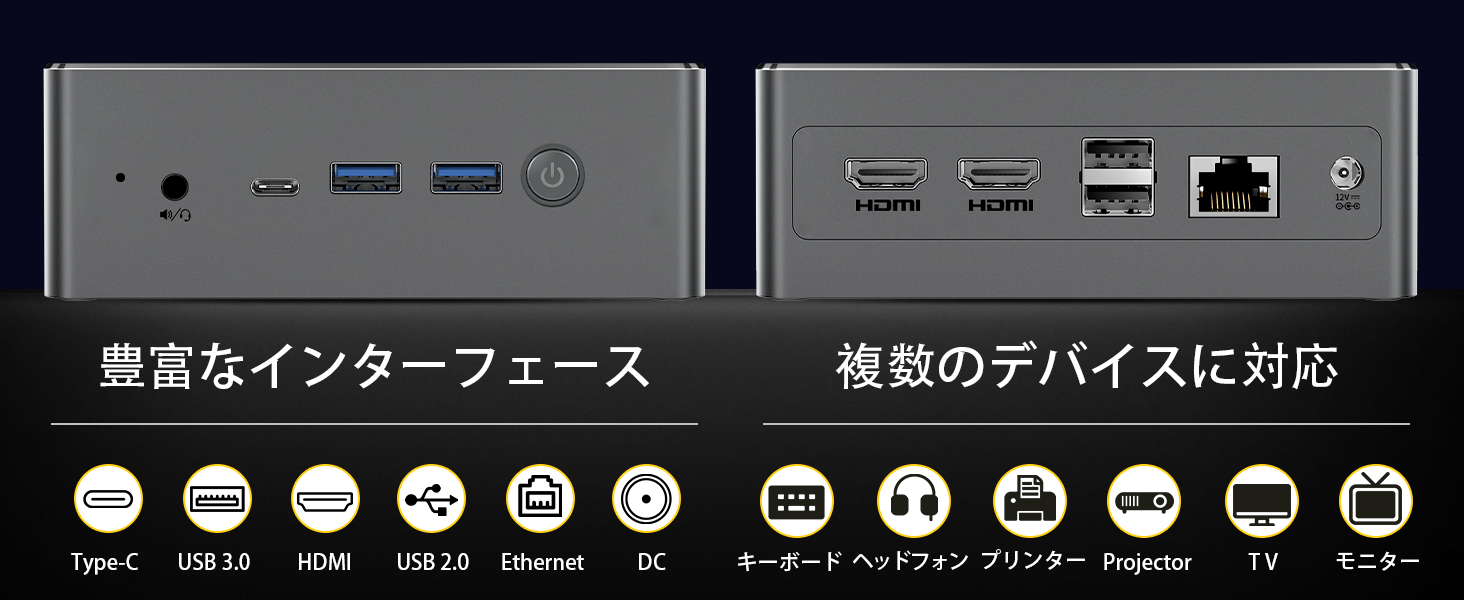 ミニpcはHDMI 2端子+Type-C端子で、4K@60Hzの高精細画質3画面出力対応し、ワークスペースを拡張することで生産性が高めます。4K@60Hzと高くの高精細画質出力に対応します。画像や音声などの処理スピードが高速で、ビデオや画像などの再生をよりスムーズにし、グラス最高のビデオなど鑑賞体験を提供します。