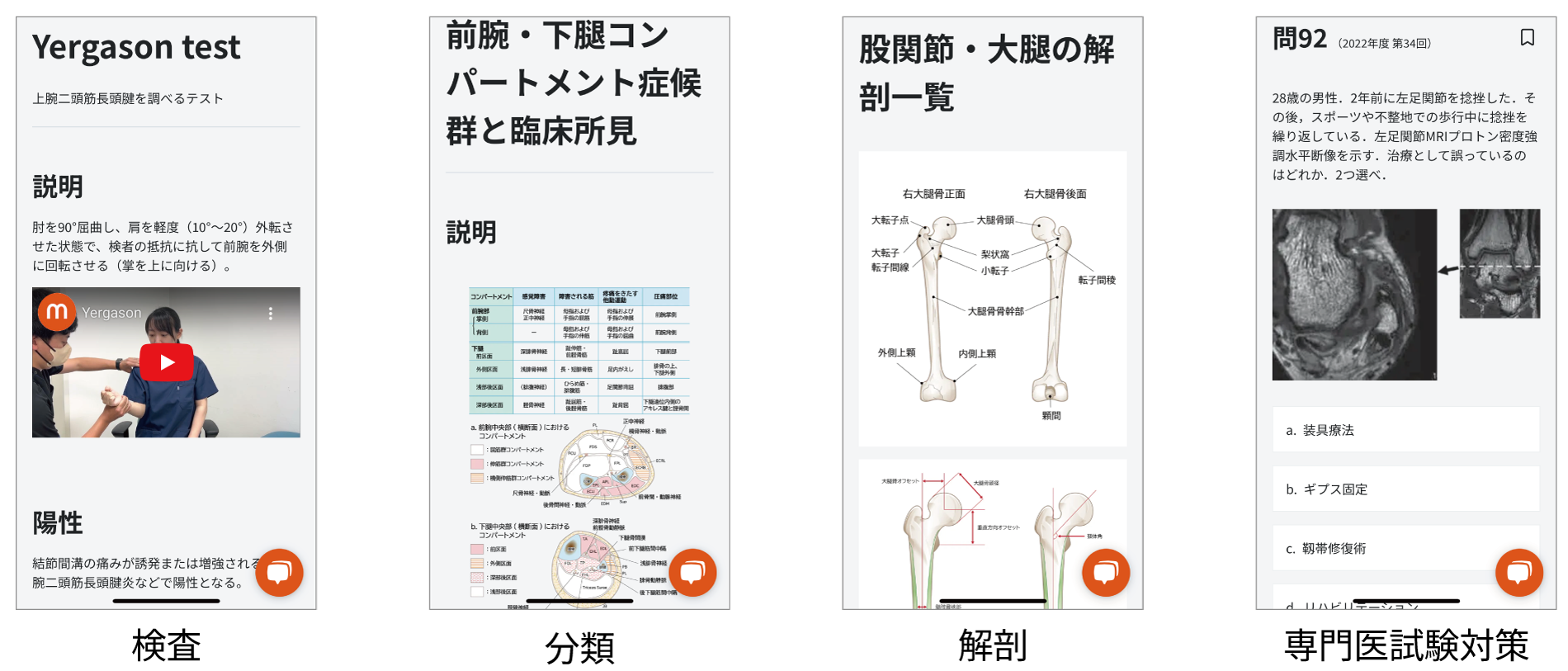 整形外科の実際の診察手技や誘発テストが動画で学習できる。解剖や分類の確認も視覚的で見やすく、今の時代にあったアプリです。今後、さらに専門医試験対策などの内容の充実が期待できる教育ツールです。