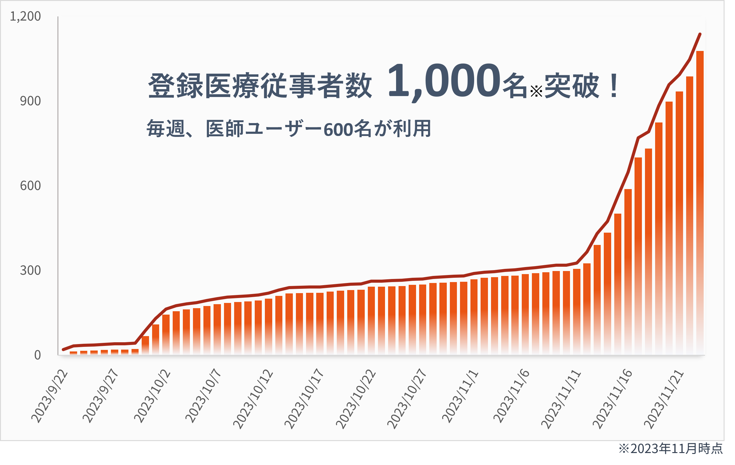 公開後1ヶ月でユーザーが300名、2ヶ月で1,000名を突破。整形外科医をはじめ、内科医、看護師、理学療法士など、整形外科的治療に関わる幅広い職種の医療従事者にご登録をいただいております。週間アクティブ率は60%前後と高水準を推移し、ユーザーの皆様からもご好評いただいております。今後、数々の大型アップデートを控えており、さらなるユーザー増加を見込んでいます。