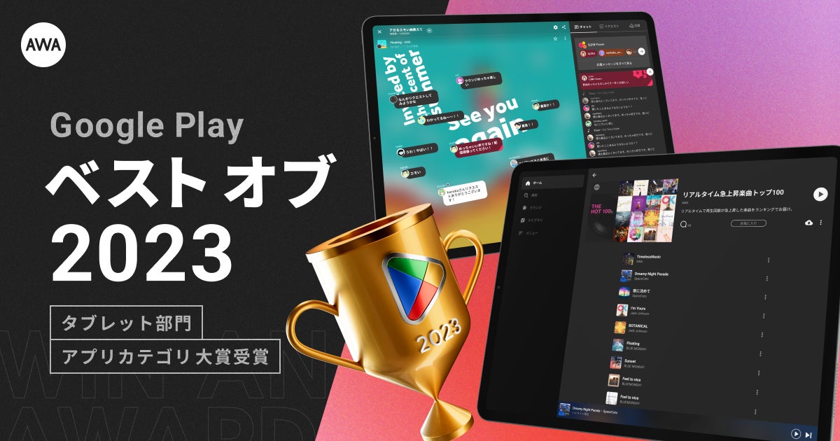 AWA株式会社(本社:東京都港区、代表取締役CEO:冨樫晃己)が運営する、サブスクリプション型(定額制)音楽ストリーミングサービス「AWA(アワ)」は、Google Play ベスト オブ 2023 において、「タブレット部門 アプリカテゴリ」の大賞を受賞しました。