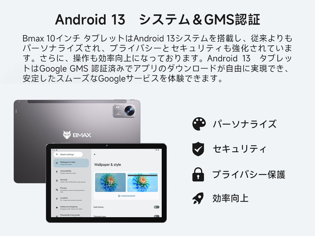 I10Pro タブレットは最新Android 13 OSを搭載し、個人のプライバシー保護とセキュリティをアップグレードし、アプリに必要なストレージ容量のマウントを減らし、ランタイムデバイスの性能を向上させます。