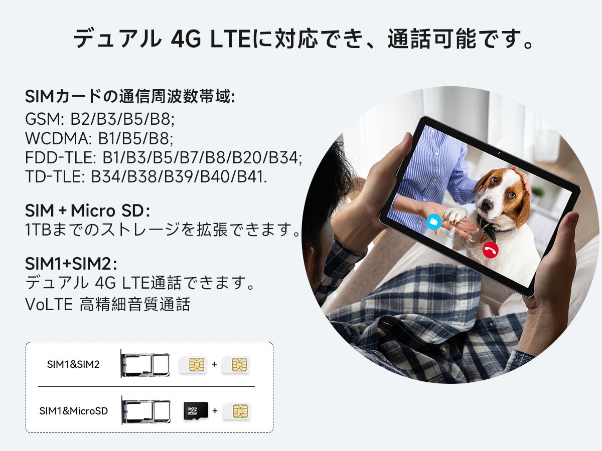 Tablet Android13 は4G LTE通信に対応可能になり、SIMスロットはデュアルNano-SIMカードに対応もできます。いつでもどこでも家族と幸せな時間をシェアすることができます。