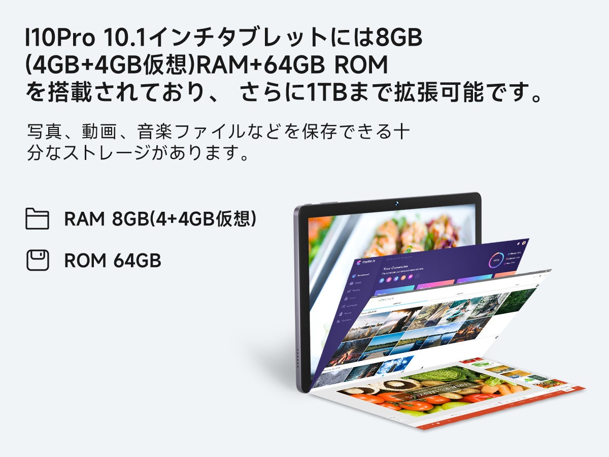 I10Proタブレットには 4GBのRAMと64㎇ROMを搭載し、RAMの拡張機能があり、ストレージを最大4GBまで仮想メモリに回せます。合計大容量8GBRAMがあるため、実行速度が大幅に向上しております。