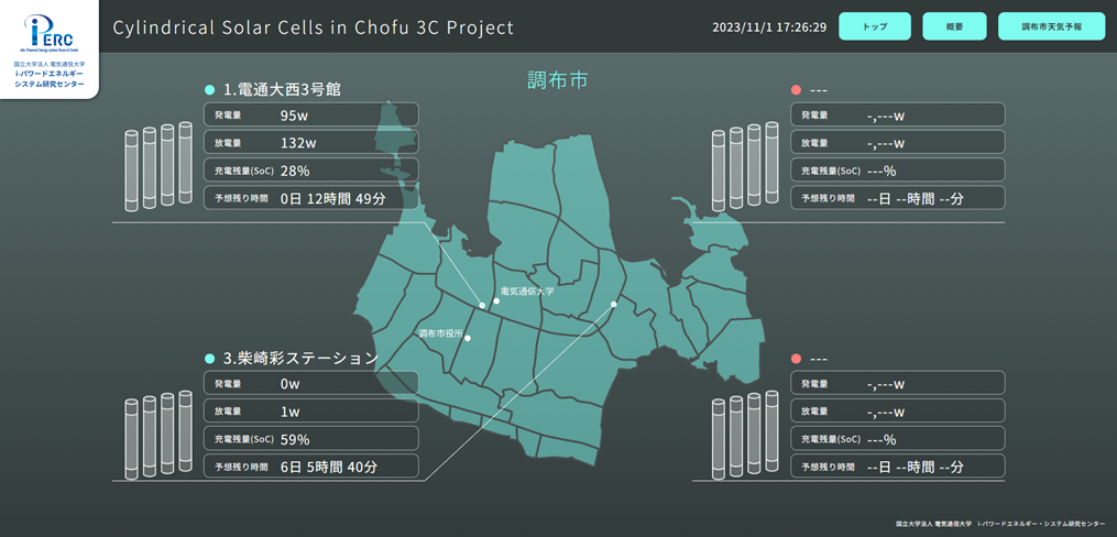 電力を見える化するモニタリングダッシュボード(図4)を開発しました。今後,市内各地に設置予定の円筒形太陽電池の発電量と蓄電池の状況をインターネット上に可視化していきます。