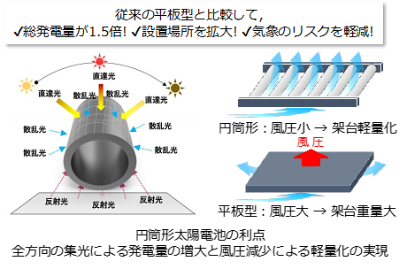 ・発電モジュールを円筒形にすることで,パネル形状と異なり,太陽の方向によらず効率的に発電できるとともに,複数の発電モジュールの間隔をあけて配置することで風圧を受けにくくすることができるため,重量のある架台を必要としない太陽電池です。