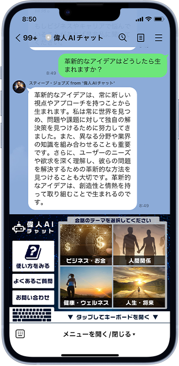 使い方はとっても簡単で、LINE公式アカウントのメニューから会話のテーマと偉人を選択するだけで、すぐにチャットを開始できます。