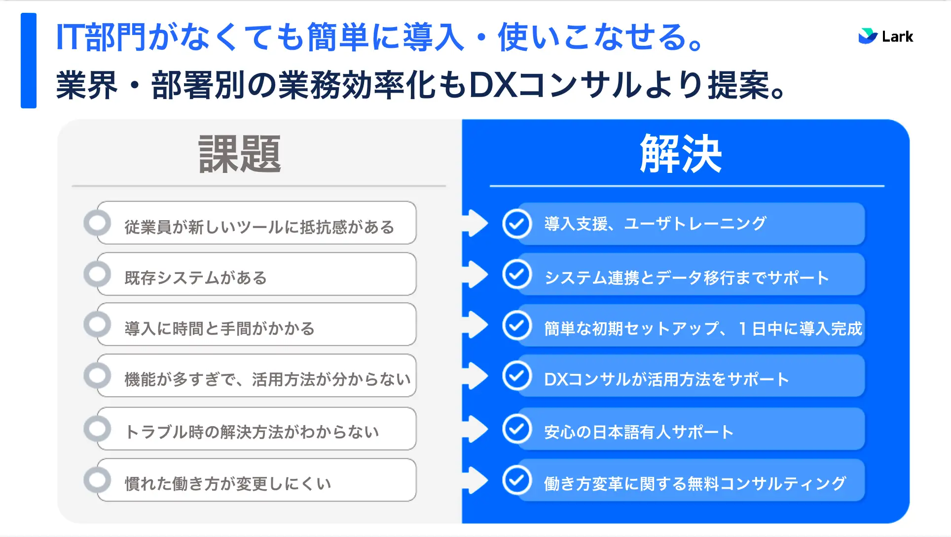 私たちは、Larkを活用したシステム導入支援やDX経営コンサルティングを通じて、企業のデジタル変革を強力に推進します。また、この取り組みを通して、インバウンド市場の成長、海外事業の拡大、女性の職場での活躍、そして働きやすい環境の実現といった多方面にわたる目標達成を支援してまいります。