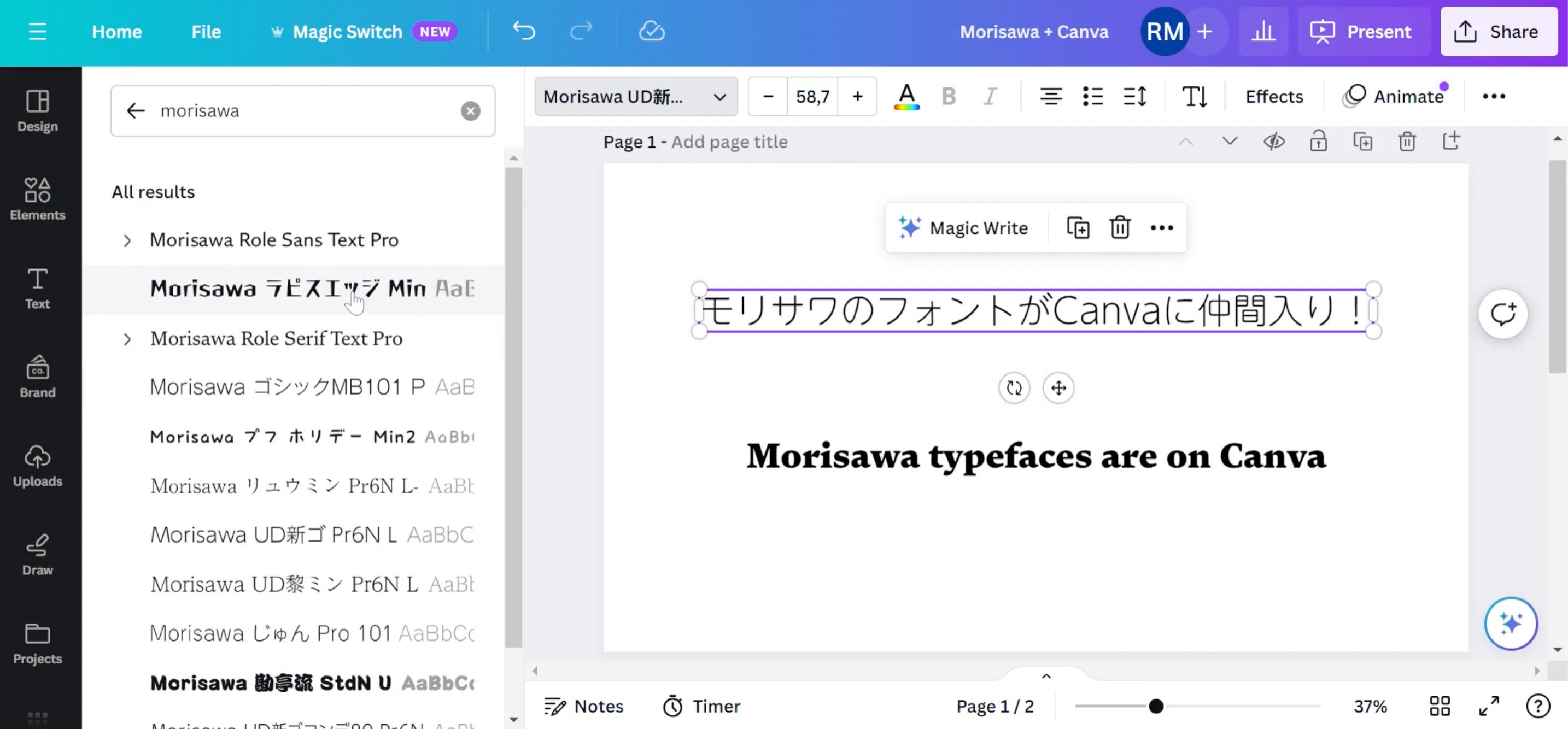 今回提供したのは、スタンダードな明朝体「リュウミン」やUD(ユニバーサルデザイン)フォントである「UD新ゴ」、近年ではうちわ文字としても人気の筆書体「勘亭流」など日本語10書体と、欧文フォント「Role」です。「Role」は4つのスタイルと3つのサイズシーンに最適化されたデザインのバリエーションを持つ、200書体を誇る欧文スーパーファミリーで、今回提供したのはRole Serif Text ProとRole Sans Text Proの2つのファミリーから32書体です。モリサワのフォントラインナップは、フォントメニュー名の冒頭に「Morisawa」と記載があるため探しやすくなっています。今後これらのフォントが、世界中のCanvaのデザインコミュニティで利用できるようになります。