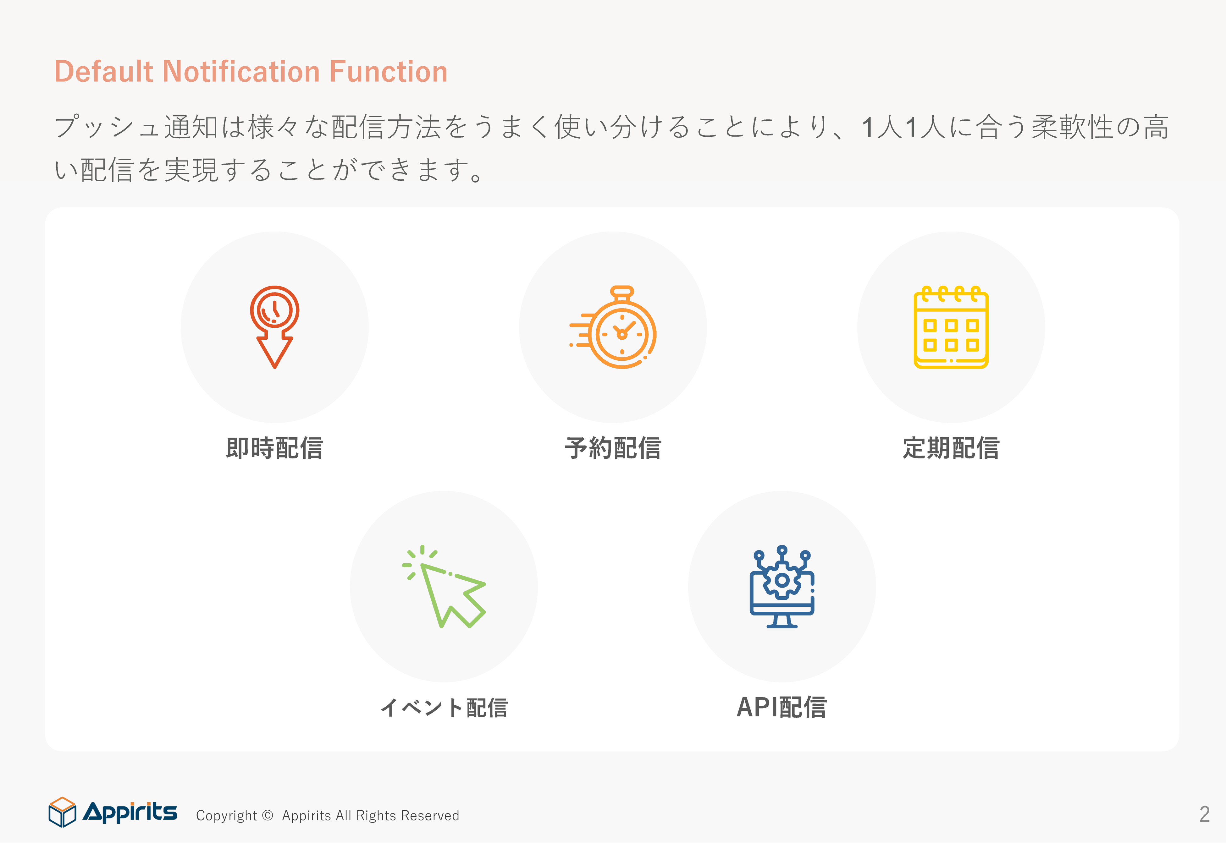 株式会社アピリッツ(本社:東京都渋谷区、代表取締役社長執行役員CEO:和田 順児)は、ECサイトなどWebビジネスで幅広く活用されているプッシュ通知の配信機能の比較を目的とした、ホワイトペーパーを本日公開いたしました。サイトを利用するユーザー1人1人に合わせた効果的なプッシュ通知を配信する上で有効な5つの機能をご紹介しております。ぜひご覧ください。