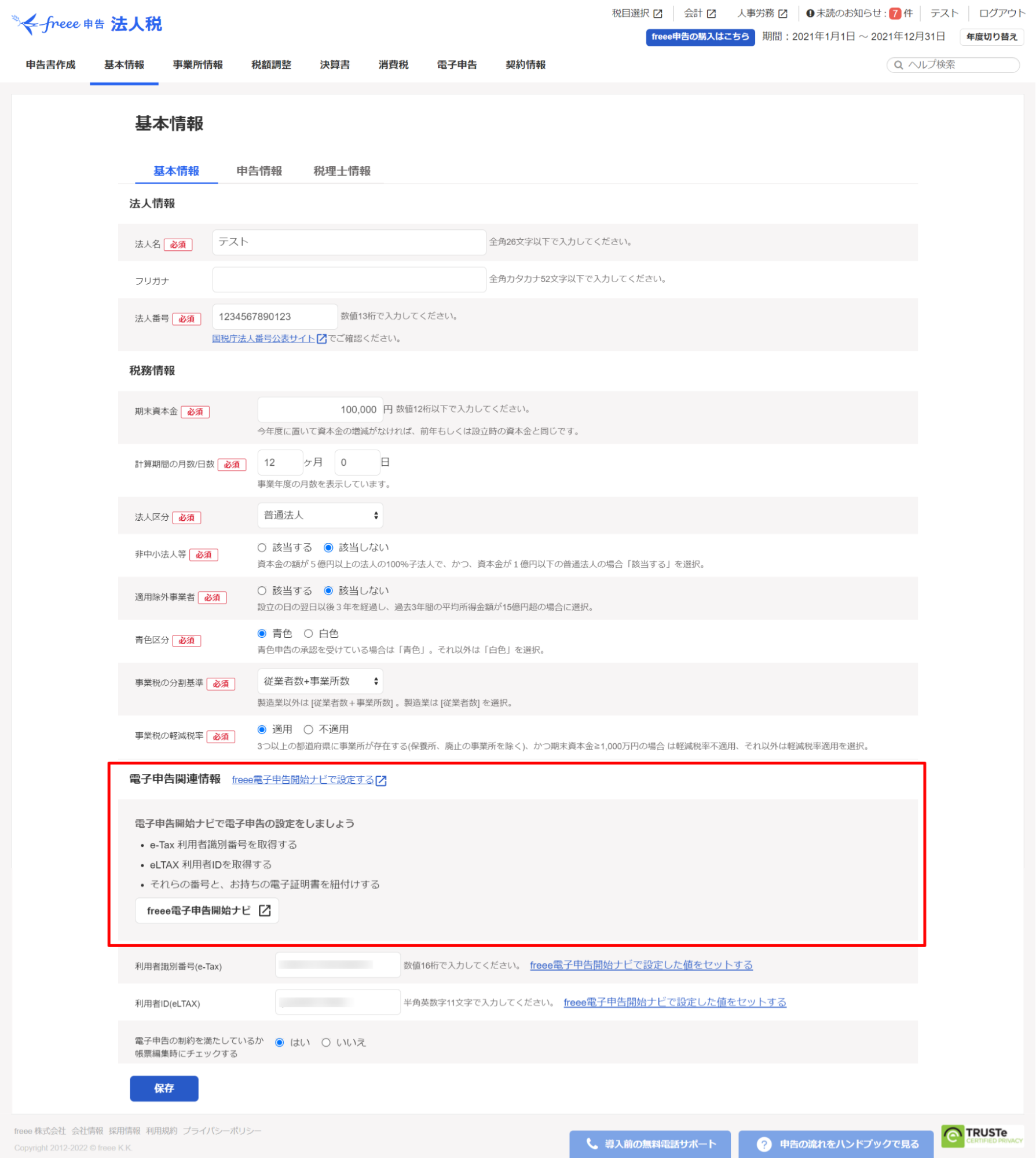 法人向け 電子申告開始ナビは、「freee申告」ログイン後「基本情報」設定画面よりご利用いただけます。