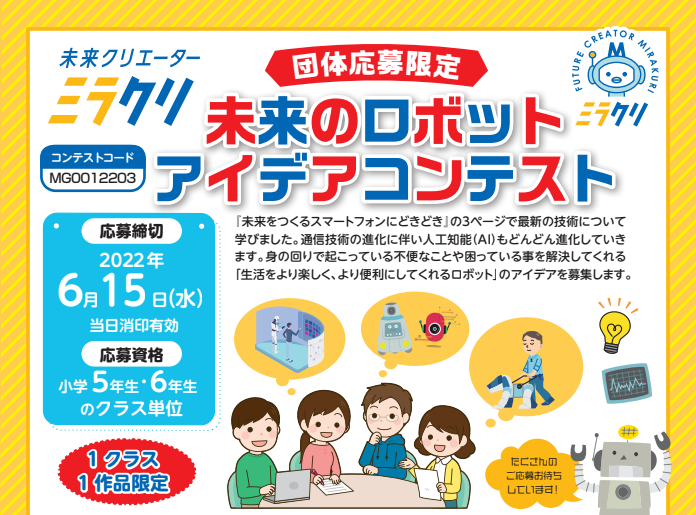 ミラクリ(未来クリエーター)は、株式会社ソーシャルサービスが企業と連携して副教材を制作し、無料で配布する学校教育支援事業です。このたびはソフトバンク株式会社の協力で制作した、社会科や総合学習の授業に役立つ冊子『未来をつくる スマートフォンにどきどき』の中で、ソフトバンクロボティクス株式会社の協力のもと、本コンテストを実施しました。