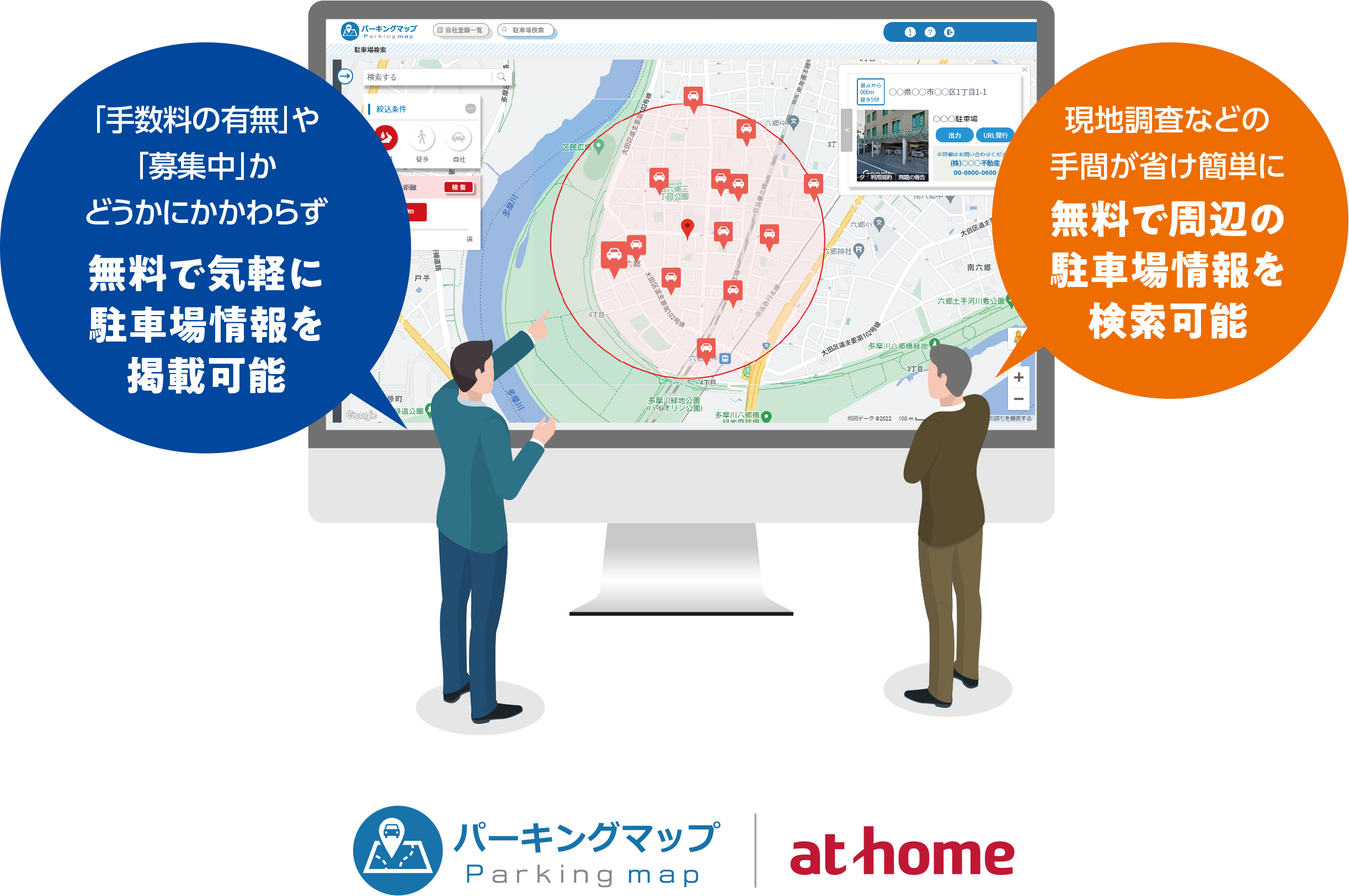 このたび、アットホームは加盟店専用サイトやATBBの各機能から物件選定時の重要な要素である「貸駐車場(月極駐車場)」情報を簡単に掲載・検索できるサービス「パーキングマップ」に遷移する導線を設置し、ATBBの物件情報との連携を開始いたしました。これにより、不動産仲介会社はパーキングマップを使って、物件周辺の「貸駐車場(月極駐車場)」情報の検索が簡単にできます。物件の駐車場の有無を気にせず物件の紹介がスムーズになり、物件選択の幅が広がります。またパーキングマップの一部機能も改修し、さらに利便性が向上いたしました。