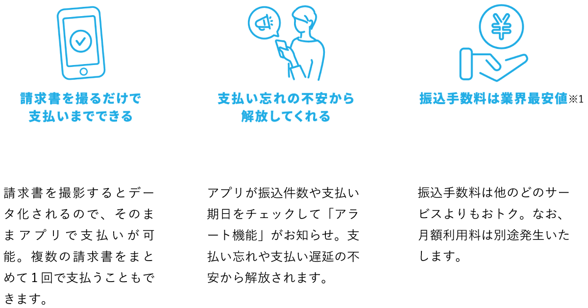 『Airインボイス』は、請求書をスマホで撮影するとアプリが振込に必要な情報を自動でデータ化し、振込予約・実行までがスマホひとつで可能となるサービスです。振込手数料は業界最安値(※1)を実現しています。『Airインボイス』があれば、アプリが振込件数や支払い期日をチェックしてお知らせするので、支払い忘れや支払い遅延の不安から解放されます。(※2)