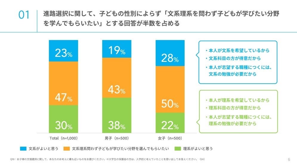 お子様の文理選択に関する保護者の考えについての質問をしたところ、子どもの性別によらず、約半数の保護者が「子どもが学びたい分野を選んでもらいたい」と考えていることが判明しました。