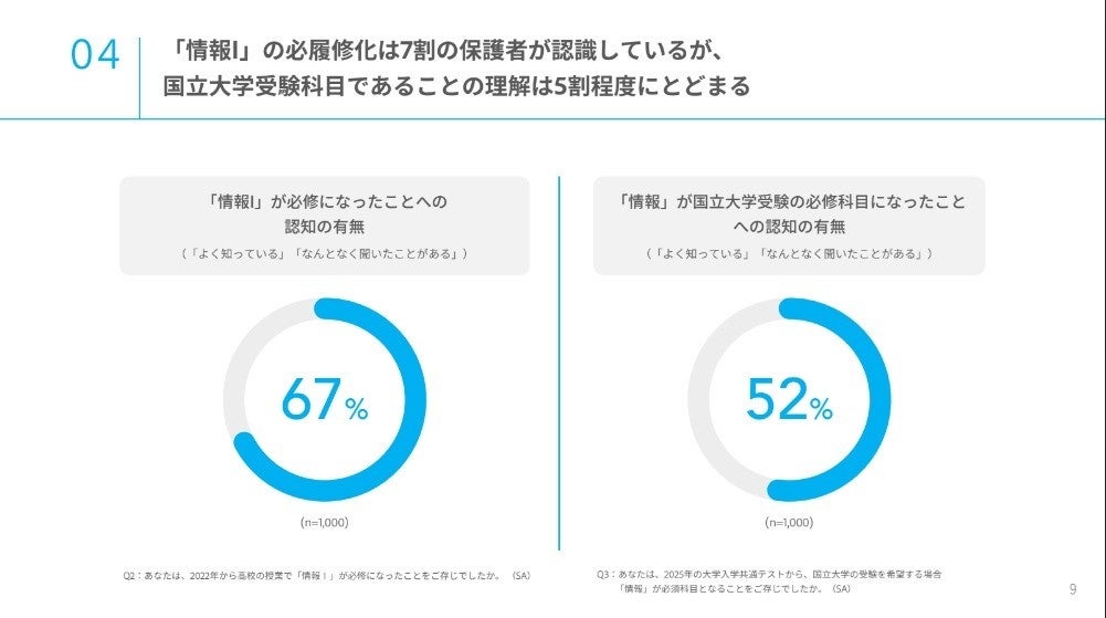 2022年から高校の授業で「情報Ⅰ」が必履修化になったことをに対して「よく知っている」と回答した方が20%、「なんとなく聞いたことがある」と回答した方が47%と約7割の保護者が「情報Ⅰの必履修化」を認知していたものの、2025年の大学入学共通テストから、国立大学の受験を希望する場合「情報」が必須科目となることについての認知に関しては「知らなかった」という回答が48%と、約半数の保護者が認知していないことが判明しました。