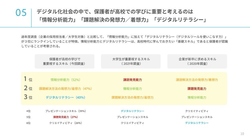 高校では情報分析や課題解決、デジタルリテラシー等のスキルを身に着け、大学では実社会における課題解決の実践を積んでほしいと考える保護者が多いことが推察されます。