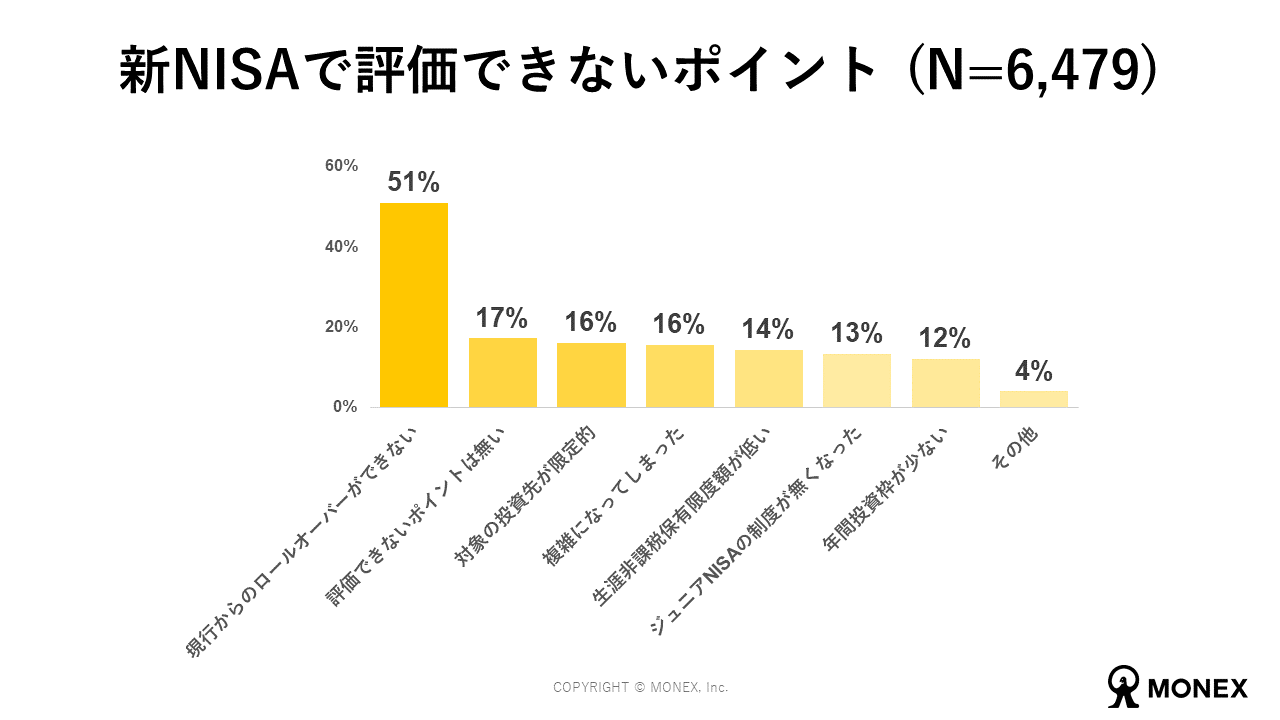 「現行NISAからロールオーバーできないこと」が評価できないポイントとして突出した結果となりましたが、次に高かったのが「評価できないポイントがない」という回答でした。評価できるポイントを聞いた回答同様、いかに今回の制度変更が評価されているのかが伺えます。