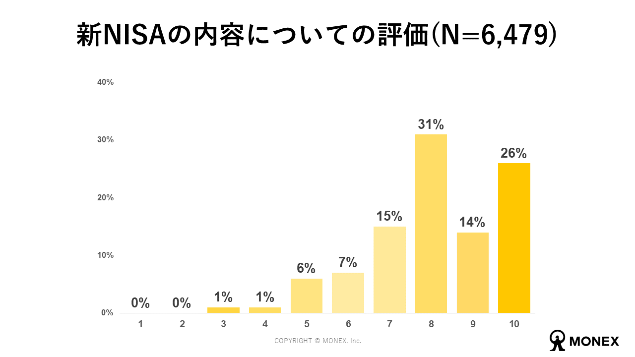 新NISAの改正内容を理解している個人投資家に今回の制度変更を10段階で評価してもらったところ、7以上の評価を付けた個人投資家が86%となりました。今回の制度変更がかなり好意的に受け取られていることが分かります。