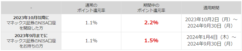 NISA口座でのマネックスカード投信つみたて(クレカ積立)に伴うポイント還元率が2023年10月以降にマネックス証券のNISA口座を開設した方は、通常1.1%のところ2.2%に。