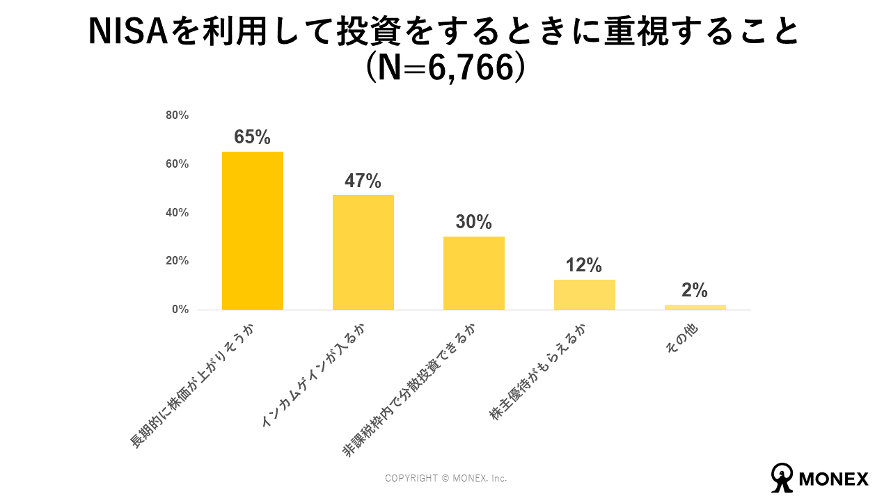 65%の個人投資家が「長期的に株価が上がりそうか」を重視しているという結果となりました。NISAを利用する際はしっかりと長期保有を目的として投資を行おうと考えていることが見て取れます。