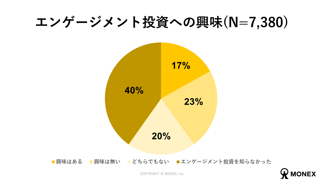 企業に対して(株主総会などで)企業価値が向上するような提案や提言を積極的に行うことを目的としたエンゲージメント投資は、まだ40%の個人投資家が概念を知らなかったものの、17%が興味を持っていました。興味の有無問わずエンゲージメント投資という概念が60%もの個人投資家に知られるようになってきたことは大きな変化と言えるでしょう。