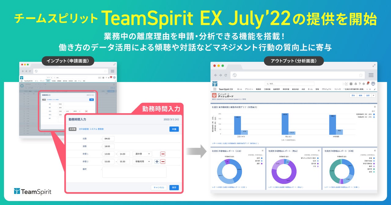 注目の機能として、役所手続き、通院、子育て・介護等の中抜けに役立つ休憩管理機能を搭載しました。勤怠管理機能では、従業員が業務中に休憩や中抜けを行う際、勤怠打刻と同時に離席理由を申請できる機能が追加されたことで、従業員の業務中における事情を伴う離席時間の内訳をマネージャーが把握しやすくなります。チームスピリットが提唱する「ワークウェルビーイング・マネジメント※」では、従業員一人ひとりが前向きに自分らしく働けるよう、従業員への傾聴やデータに基づくマネージャーと従業員の対話を推奨しています。休憩管理機能をはじめとする今回の「TeamSpirit EX July’22」の機能追加を通じて、従業員一人ひとりのワークウェルビーイング向上が促されることを期待します。
