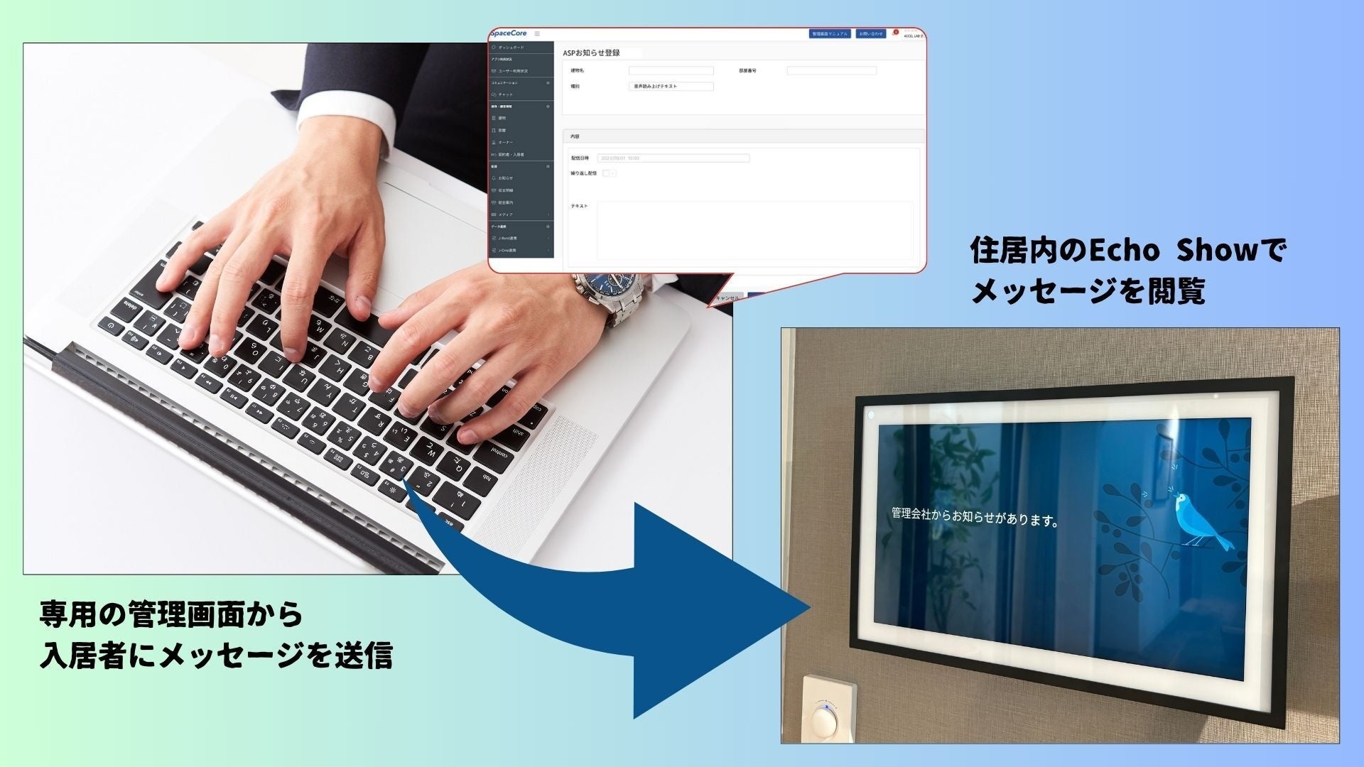 例えば、「Alexa Smart Properties」によって、「SpaceCore」アプリだけでは実現できなかった、“音声”を活用したスマートホーム機器の操作が可能になります。また、これまでも「SpaceCore」では居住者と管理会社がアプリ内でコミュニケーションを取れる機能を提供してきましたが、「Kolet」内に取り付けられたスマートスピーカー「Amazon Echoシリーズ」より、音声によって管理会社からのお知らせを受け取ることも可能となります。