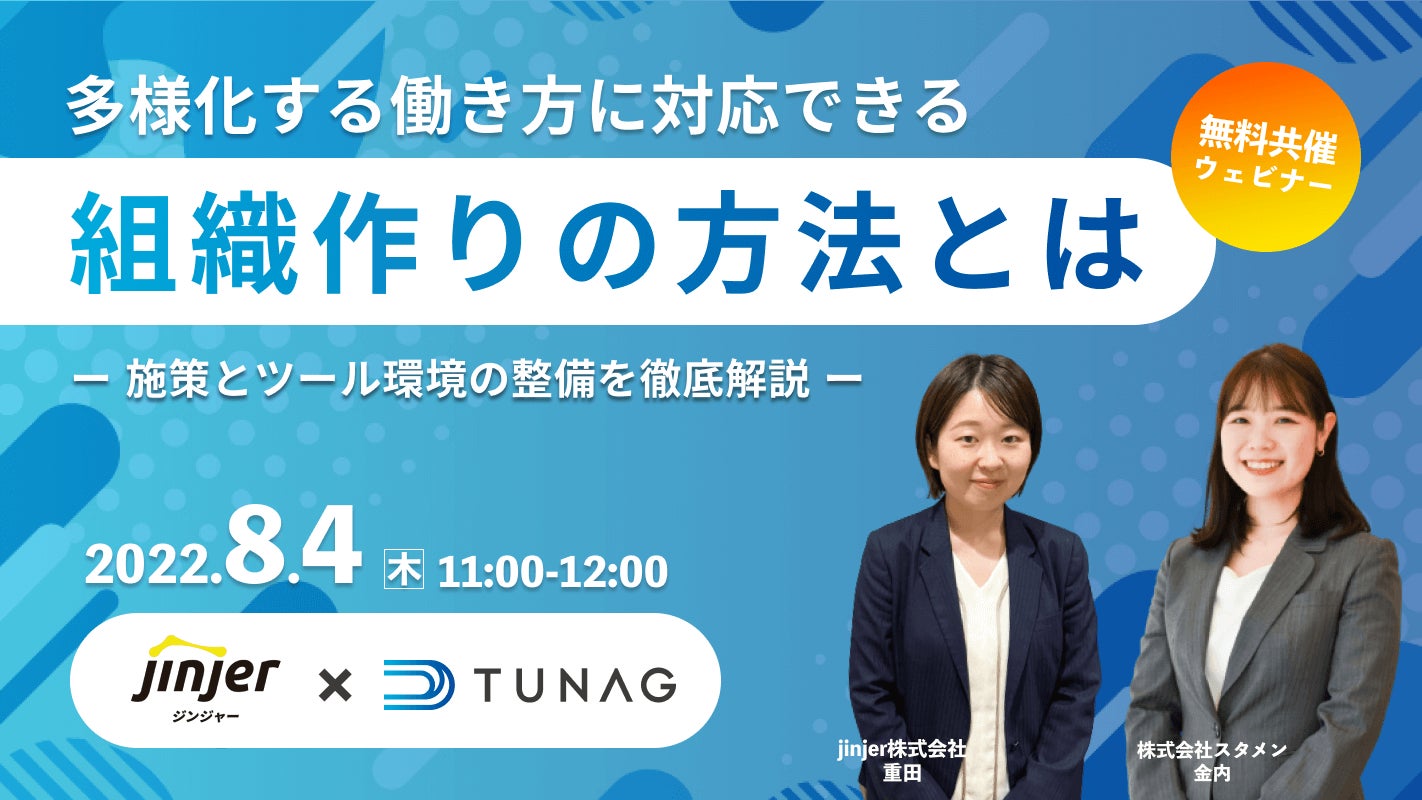 この度TUNAGは、バックオフィス向けクラウドサービス『ジンジャーシリーズ』を開発・提供するjinjer株式会社と、「多様化する働き方に対応できる組織づくりの方法」についての共催セミナーを開催いたします。