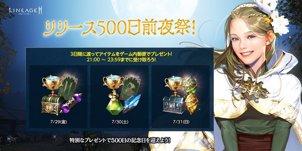 期間中、毎日21時にリリース500日記念の前夜祭として、ゲーム内郵便にて「祝福の聖物(イベント)」や「高級クラス/アガシオン獲得券(1回)(イベント)」「成長のポーション(10%)(イベント)」などをお送りします。