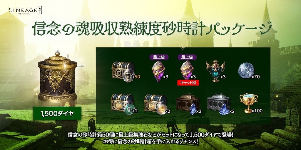 「信念の砂時計箱(刻印)」50個、「信念の最上級集魂石(11回)(刻印)」3個、「熟練度ボーナス コイン」70個などがセットになった「信念の魂吸収熟練度砂時計パッケージ」が登場しました。