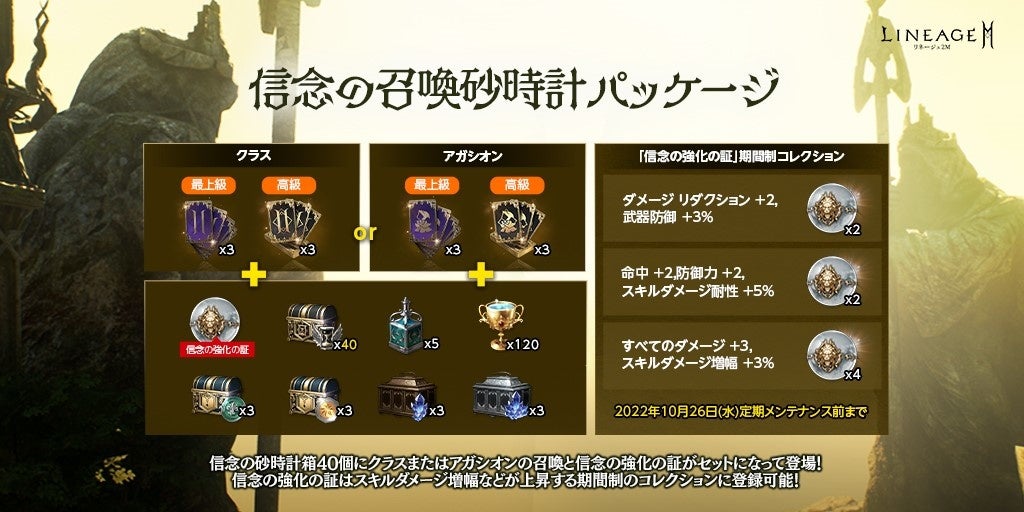 「信念の砂時計箱(刻印)」40個に、クラスまたはアガシオンの召喚66回分、「中級覚醒のポーション(刻印)」5個、「信念の強化の証(刻印)」1個などがセットになった「信念の召喚砂時計パッケージ」が登場しました。