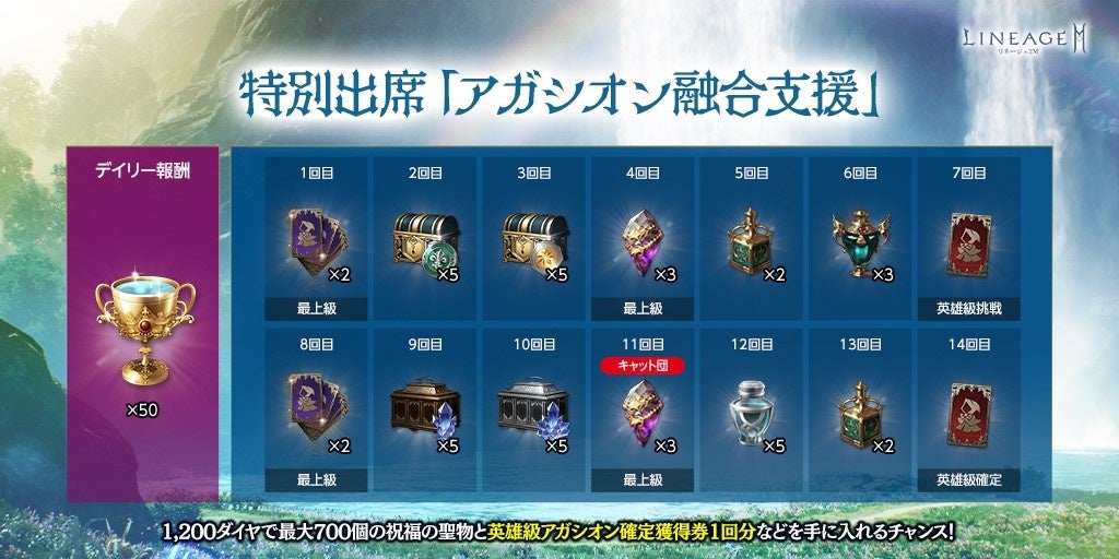 デイリー特典として「祝福の聖物」50個のほか、「信念の最上級アガシオン獲得券(11回)(刻印)」などアガシオン召喚最大46回分と、「祝福されたアインハザードの聖水(刻印)」などのアイテムを獲得することができます。