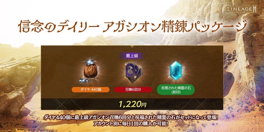 ダイヤ440個と、「信念の最上級アガシオン獲得券(6回)(刻印)」1個、「祝福された精霊の石(刻印)」1個がセットになった「信念のデイリー アガシオン精錬パッケージ」が登場しました。