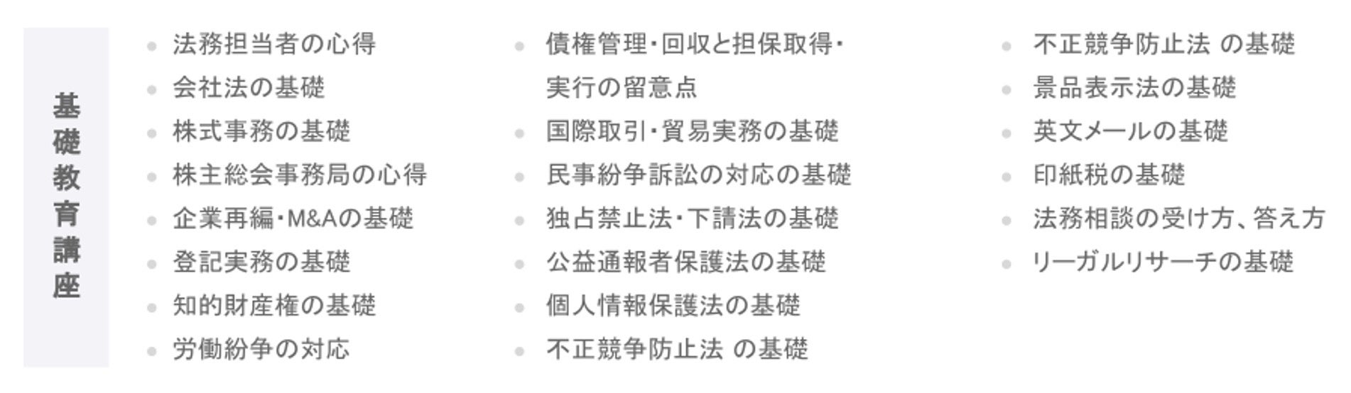 企業法務の基礎から最新情報が学べる「動画コンテンツ」は、下記一覧の基礎教育講座(順次公開予定)の動画がいつでも見られます。新任法務の方でもOJTだけでなく、自学自習により体系的に企業法務を学ぶことができます。また、事業部門の方が契約の基礎を学ぶためのコンテンツも掲載し、法務部門と事業部門へのコミュニケーションを円滑にし、ビジネスのスピードを早めることにも繋がります。