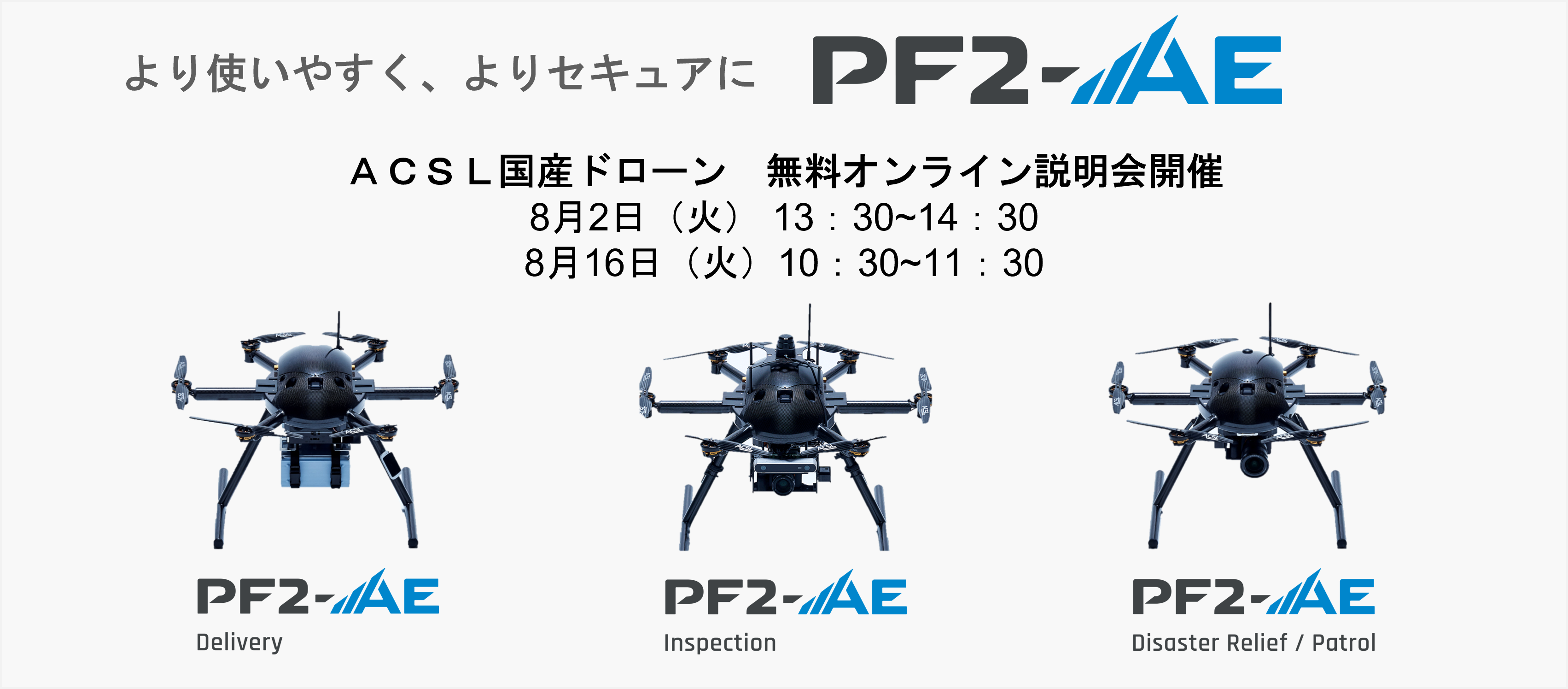 「PF2-AE」は、国産の中型プラットフォーム機体ACSL-PF2をより使いやすく、よりセキュアにカスタマイズした3タイプの産業用ドローンで、2022年8月より受注開始予定です。