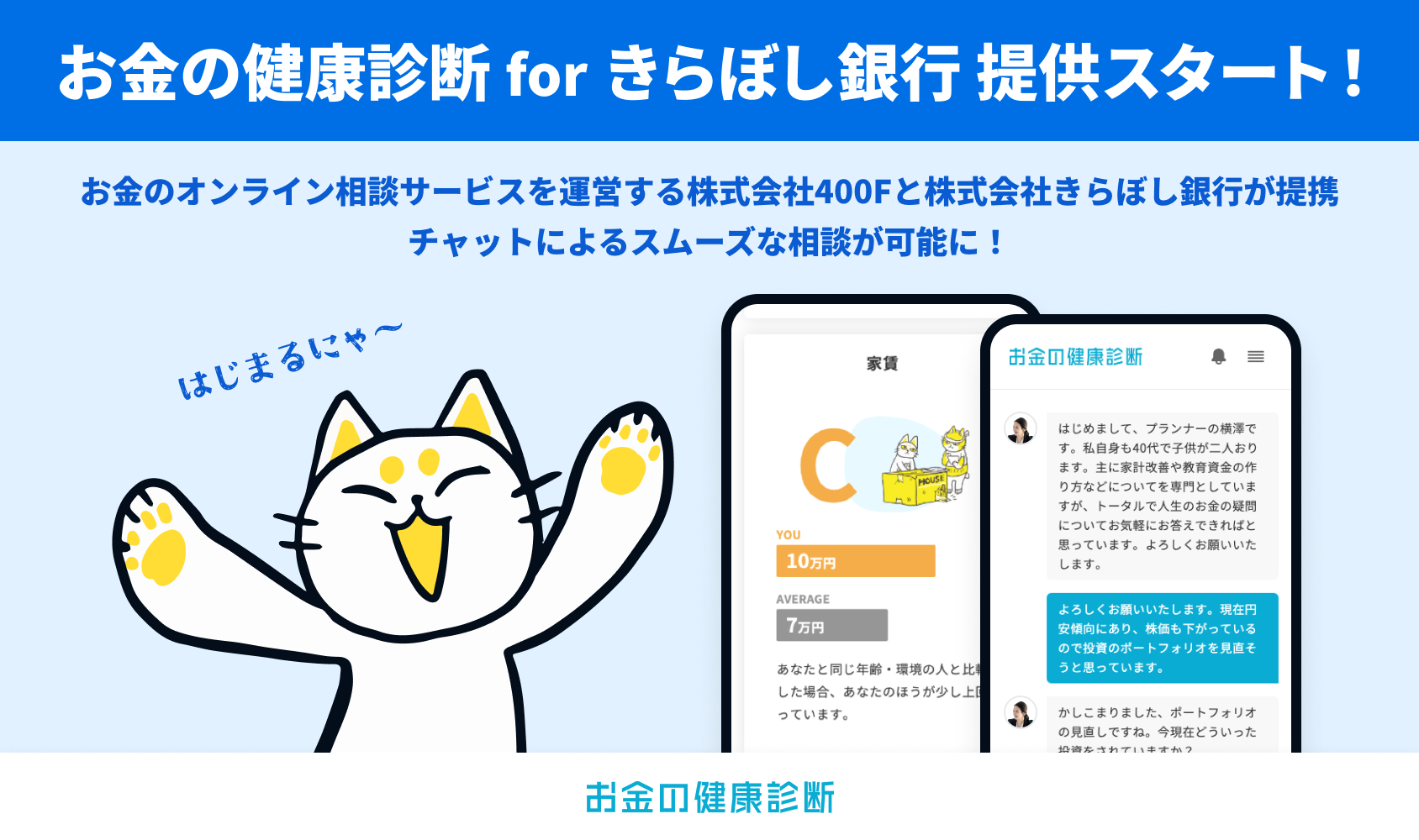 一方きらぼし銀行は既存顧客に先進的な非対面サービスを提供すること、これまでアプローチできなかった非対面サービス利用ニーズのある新規顧客の獲得に向けて先進的なサービス提供の方法を模索していました。特に普段営業店からのコンタクトが難しい若年層や資産形成層のお客様や漠然としたお金に対する不安を抱えているもののご自身の不安が顕在化してないお客様に対し、400Fが提供する「お金の健康診断」がきらぼし銀行のサービスをご案内可能なツールとして貢献できると考えております。