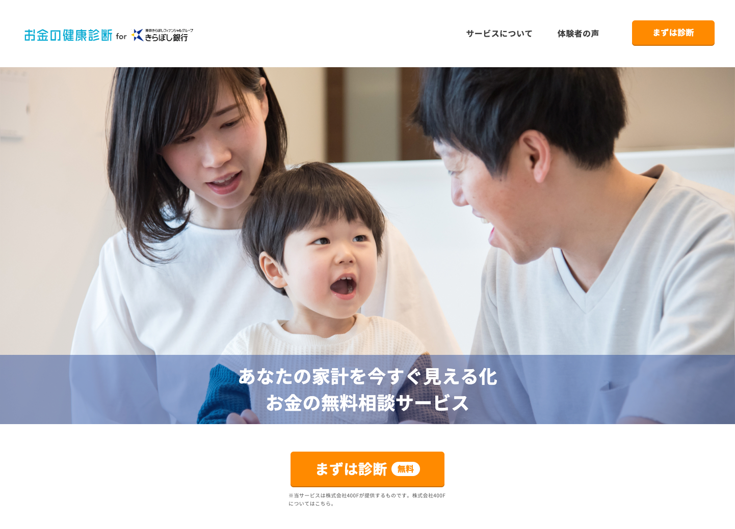 「お金の健康診断 for きらぼし銀行」は、ウェブ上で家計や家族構成、お金に関する悩みごと等についての簡単な質問に答えるだけでご自身の家計の状況を客観的に知ることができ、また、きらぼし銀行の行員に、資産運用等に関して無料相談することができるオンラインチャット相談サービスです。当社は、きらぼし銀行が、本サービスを通じて、お客様の資産運用相談に関するご要望に、対面チャネルのみならず非対面チャネルにおいても柔軟にお応えするのをサポートいたします。