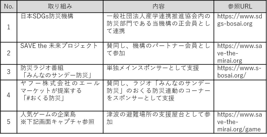 日本の数多くの中小企業が、災害に対する高い意識を持つための機会提供をしていくために、当社は防災および事業継続の推進企業として、下記の取り組みを行っております。