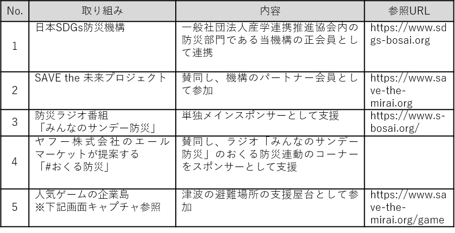 日本の数多くの中小企業が、災害に対する高い意識を持つための機会提供をしていくために、当社は防災および事業継続の推進企業として、下記の取り組みを行っております。