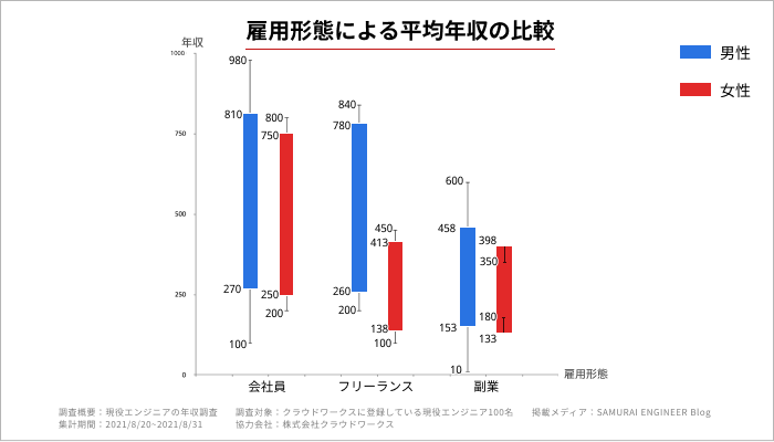 次に、雇用形態別のエンジニアの平均年収を調査したところ、「会社員」かつ「男性」が最高値であることがわかりました。会社員の場合、男性と女性の間では「約60万円」の平均年収差があることもわかります。