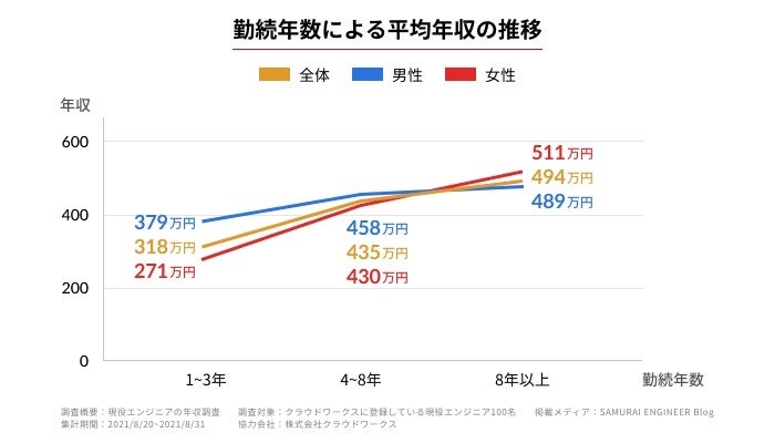 また、勤続年数によるエンジニアの平均年収を調査したところ、性別を問わず年収は「上昇傾向」であることが判明しています。さらに女性の場合、勤続が「8年以上」に到達すると、男性の平均年収を上回っていくことも明らかになりました。