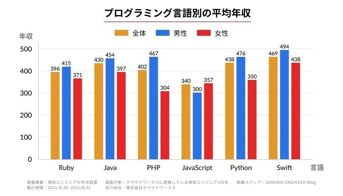[5]プログラミング言語別のエンジニアの平均年収は僅差で「Swift」が最高値