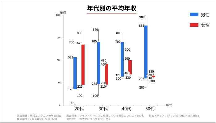 [4]年代別のエンジニアの平均年収は、男性の場合「30代」と「40代」がほぼ横ばい